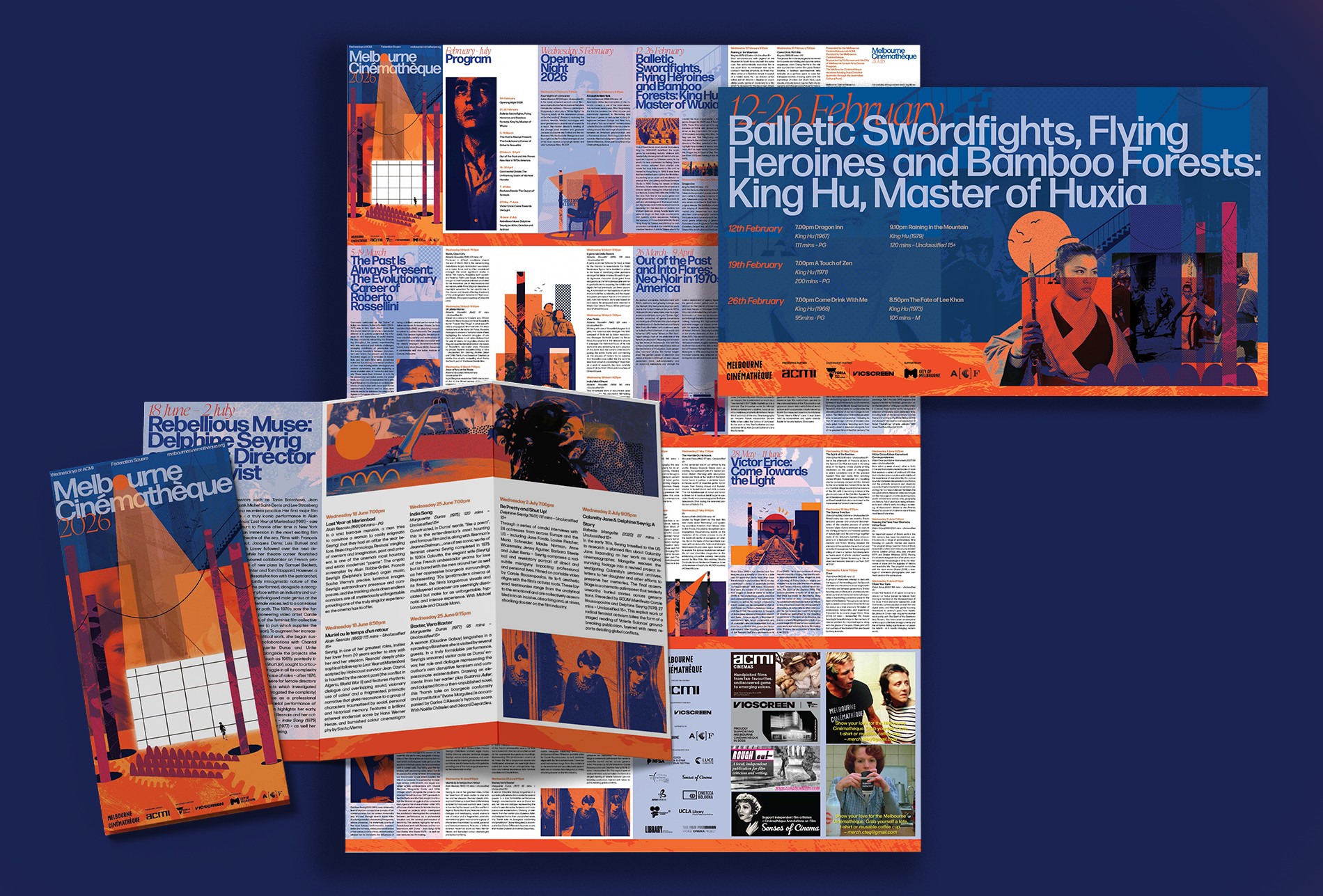 Through the consistent application of the vibrant orange ‘ground’, the A1 calendar becomes a map with which readers can explore the creative, avant-garde landscape of the Melbourne Cinémathèque.